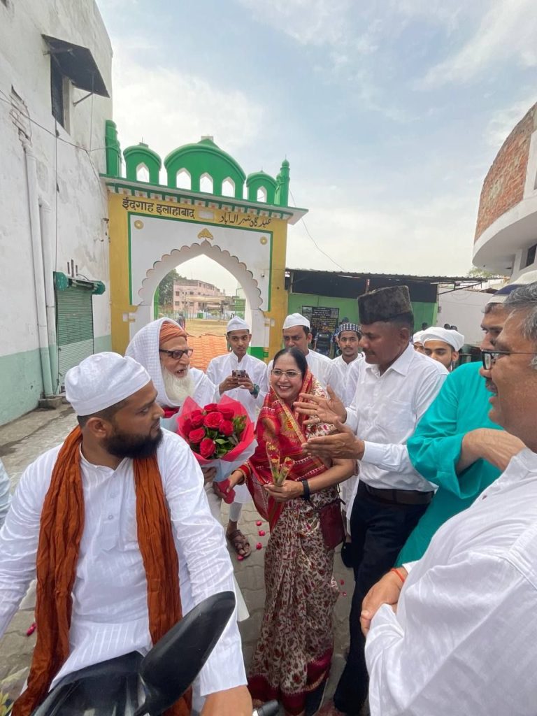 गंगा जमुनी तहजीब व कौमी एकता की मिसाल रजिया सुल्तान की ओर से ईदगाह के नमाजियों, उपस्थित शहरवासियों, पुलिस प्रशासनिक अधिकारियों एवं समाज सेविकों आदि को गुलाब फूल, मिनरल वाटर व सिवई चासनी भेट कर इदुलफित्र की हार्दिक मुबारकबाद दी गयी।