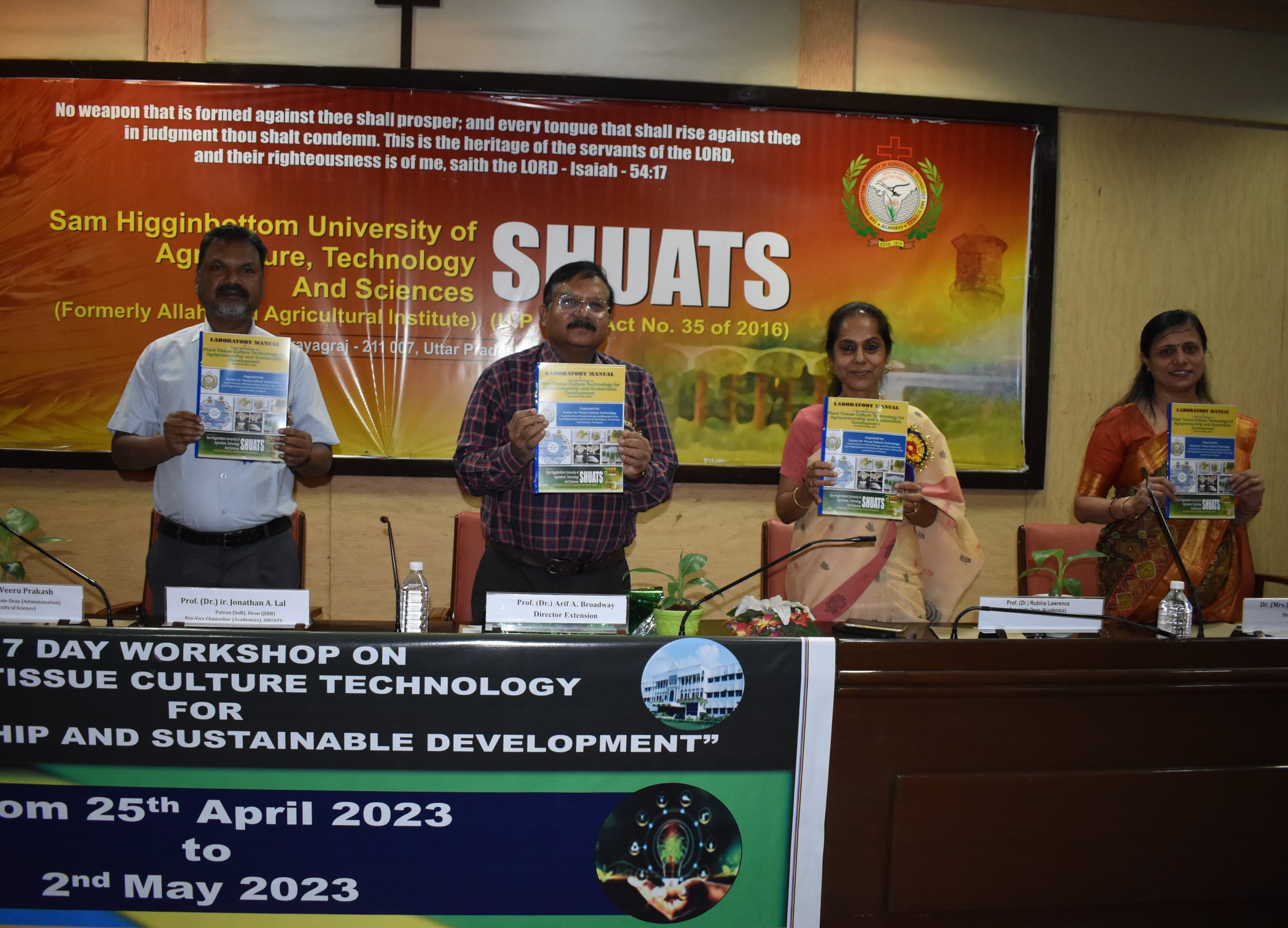 प्रोफेसर डॉ. आरिफ ए. ब्रॉडवे, निदेशक, विस्तार निदेशालय, शुआट्स ने इस अवसर पर मुख्य अतिथि के रूप में शिरकत की। उद्घाटन भाषण में, उन्होंने प्रतिभागियों के करियर विकास में इस कार्यशाला के महत्व पर प्रकाश डाला और उन्हें फसल उत्पादन और उत्पादकता बढ़ाने में किसानों की मदद करने के लिए प्रेरित किया। उन्होंने कार्यशाला की स्मारिका का विमोचन भी किया। कार्यशाला के आयोजन सचिव डॉ. गुरुदयाल राम गुरु ने धन्यवाद ज्ञापित किया।