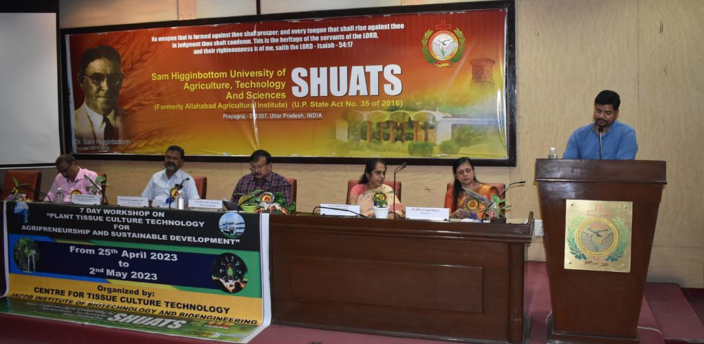 नैनी, प्रयागराज। शुआट्स में प्लांट टिश्यू कल्चर पर सात दिवसीय कार्यशाला का उद्घाटन हुआ। यह कार्यशाला सेन्टर आफ टिश्यू कल्चर टेक्नोलॉजी द्वारा आयोजित की जा रही है। कार्यक्रम की शुरुआत डॉ. ईपेन पी. कोशी (कार्यशाला के सह-आयोजक सचिव) द्वारा प्रार्थना के साथ की गई, जिसके बाद अतिथियों का स्वागत किया गया। डॉ. प्रगति शुक्ला (प्रमुख, सेंटर फॉर टिश्यू कल्चर टेक्नोलॉजी और कार्यशाला संयोजक) द्वारा कार्यशाला और सेंटर का संक्षिप्त विवरण दिया गया।