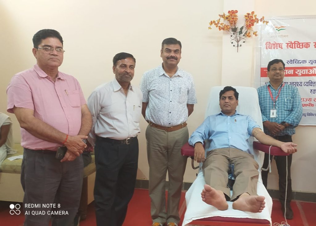 मुक्त विश्वविद्यालय के रक्तदान शिविर में कुलसचिव, शिक्षकों एवं कर्मचारियों ने किया रक्तदान।